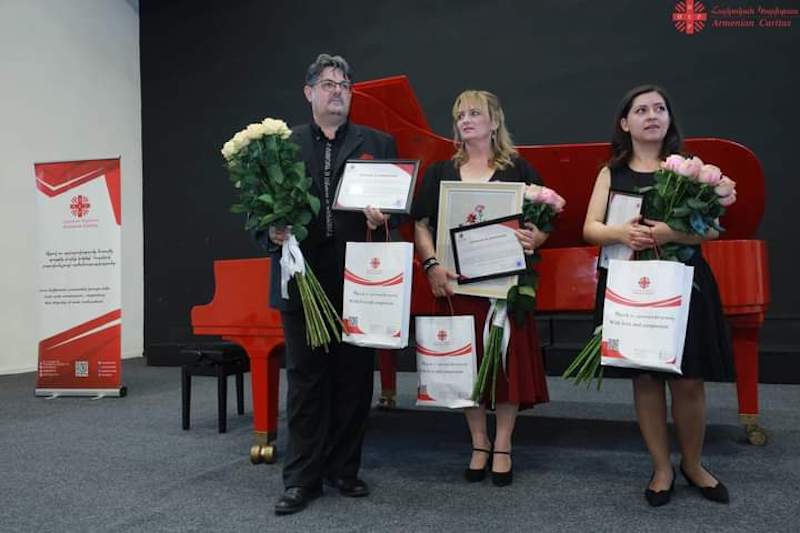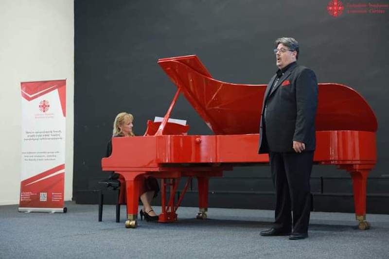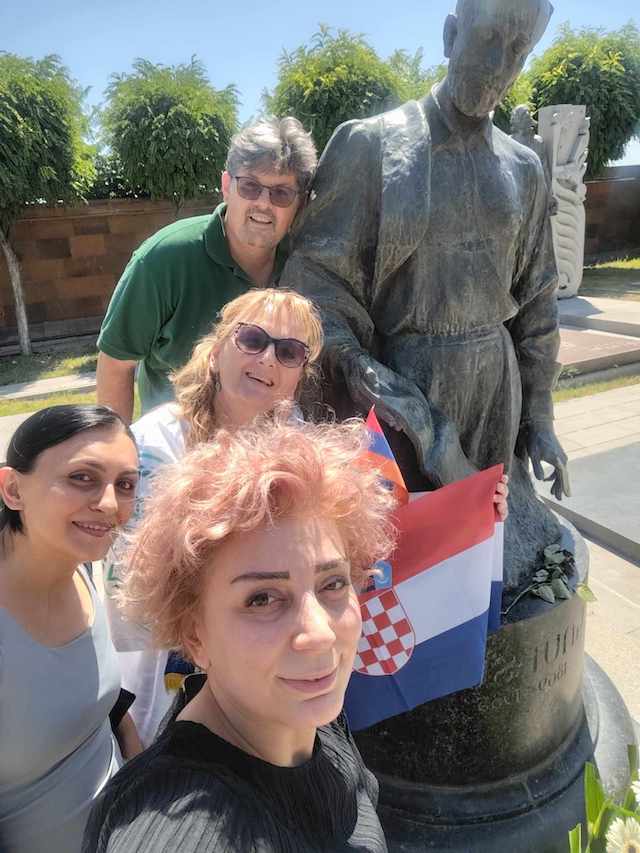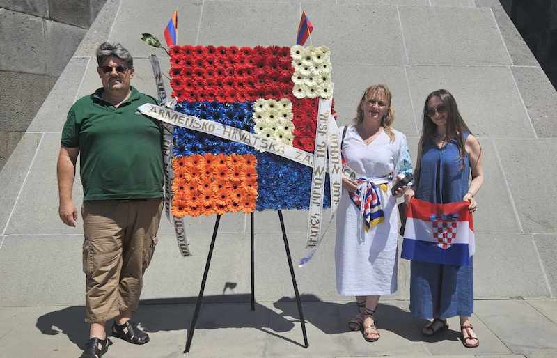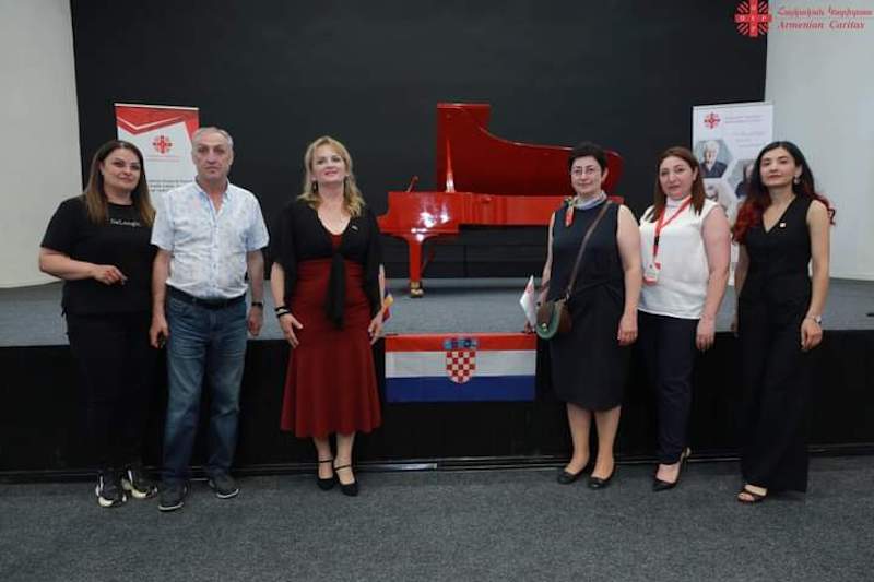 Tenor Stjepan Franetović, koncert je započeo ispred oltara, obučen u haljinu (‘kotu‘) hvarske Bratovštine Duša od pargatorija (čistilišta), te pjevao napjev Divici Mariji na stihove Marka Marulića iz 15. st., uglazbljene od don Šima Marovića, te korizmenu Epistolu, drevni hvarski napjev, koji je odzvanjao divnom akustikom Katedrale. Glazbenici su izveli skladbe hrvatskih skladatelja Albe Vidakovića, o. Kamila Kolba, Anđelka Klobučara, Vinka Glasnovića, te G. Verdija i G. Puccinija i C. Francka, te drevne i predivne armenske liturgijske napjeve ‘Ter voghormya‘ i ‘Khorrhurd Khorin‘. Posebno je dirljivo bilo izvoditi Matoševe stihove Gospe Marije i Zdravo Djevo, a bez obzira što su otpjevane skladbe predstavile mahom hrvatsku glazbenu baštinu, čije je izvorište duša i narav hrvatskoga čovjeka; dirljivo je bilo osjetiti kako se stihovi hrvatskih sakralnih i pučkih napjeva, mogu, bez dvojbe, primijeniti i na armenski narod, te su na taj način predstavljale zajedničku molitvu za Armeniju i Hrvatsku, na armenskome tlu, u crkvi najstarije kršćanske države – Armenske Apostolske Crkve, u katedrali u Gyumriju – po prvi puta u povijesti; ispjevanu i izmoljenu. Stjepan Franetović, Eva Kirchmayer Bilić i Arpy Vardanyan u 24. lipnja su u Komornoj gradskoj dvorani u Gyumriju održali i dobrotvorni koncert za Armenski Caritas, na poziv iznimno angažirane djelatnice Caritasa, gđe. Armenuhi Mkhoyan, a za pomoć tamošnjim starijim i nemoćnima, u Gyumriju, koji je omogućio i Grad Gyumri na čelu s gradonačelnikom g. Vardgesom Samsonianom. Gradnačelnik je primio hrvatske umjetnike i predstavnike Armenskoga Caritasa s gđom. Armenuhi Mkhoyan i suradnicima i predstavio im grad Gyumri, njegovu povijest, značajne ljude, posebno ističući duhovnu dimenziju života. Gradonačelnik je umjetnike zahvalno darovao prigodnim darovima i cvijećem. Ulaznice za dobrotvorni koncert su bile prodane i dvorana je bila puna. Arpi i Eva bile su pozvane najaviti koncert i na Armenskoj nacionalnoj televiziji, a čitav niz armenskih medija, portala i televizijskih postaja, pratio je i izvješćivao. Na koncert su došli i kolege i prijatelji iz Yerevana, te profesori područnoga Odjela Državnoga Konzervatorija Komitas u Gyumriju, s dekanicom prof. Hasmik Harutyunyan. Stjepan Franetović je pjevao pjesme i arije hrvatskih skladatelja, a Arpi Vardanyan dojmljivo je odsvirala Varijacije za klavir armenskoga skladatelja porijeklom iz Arcaha, Eduarda Gazarova, čiji sin David Gazarov danas radi kao profesor na Muzičkoj akademiji u Zagrebu. Arpi i Eva četveroručno su izvele ciklus ‘Mali šaroliki svijet‘ hrvatske skladateljice Ivane Lang, a ovacije nazočne publike izazvale su pjesma ‘Tvoja zemlja‘, i finale iz Zajčeve opere ‘Nikola Šubić Zrinjski‘, koje je na kraju koncerta otpjevao Stjepan Franetović. Hrvatski glazbenici su zajedno sa svojim armenskim prijateljima i kolegama položili cvijeće na spomeniku žrtvama genocida nad Armencima iz 1915., kao i istaknutim armenskim glazbenicima (Komitas, Hačaturyan, Babajanyan, Mirzoyan) i književnicima, redateljima, glumcima, slikarima (Isahakyan, Shiraz, Saroyan, Paradjanov, Mkrtchyan, Saryan…) u Komitasovom Parku i Panteonu koji je smješten pored Komitas Muzeja – Instituta, povezavši se putem interneta s članovima Armensko – hrvatske zajednice u Hrvatskoj. ![]() S obzirom na udaljenosti između Armenije i Hrvatske, te specifičnost armenskoga jezika, iznimna pomoć u organizaciji bili su brojni armenski kolege i prijatelji, koji su u nesebičnoj susretljivosti svakodnevno pomagali hrvatskim umjetnicima tijekom boravka u Armeniji, a Eva Kirchmayer Bilić, i u svojstvu potpredsjednice Armensko – hrvatske zajednice i predsjednice Udruge Pasionska baština, uspostavila je čitav niz kontakata i konkretnih prijedloga za suradnju s više kulturnih institucija u Armeniji, sa ciljem ostvarenja novih kulturnih sadržaja, programa i projekata, koji će, nadamo se, još intenzivnije povezati armenski i hrvatski narod, u potrazi za zajedničkim poveznicama, osobinama i korijenima. Neka glazbeni ‘pleter’ karakterističan i prepoznatljiv u arhitekturi armenskog i hrvatskoga naroda, isprepleten skladbama armenskih i hrvatskih skladatelja, koji se nalaze u temeljima i sastavni su dio europske kulturne baštine, budu nadahnuće za buduća istraživanja i kulturnu suradnju i razmjenu između hrvatskoga i armenskoga naroda. Hvala Armeniji na više nego srdačnom gostoprimstvu. Priredila: Eva Kirchmayer Bilić |