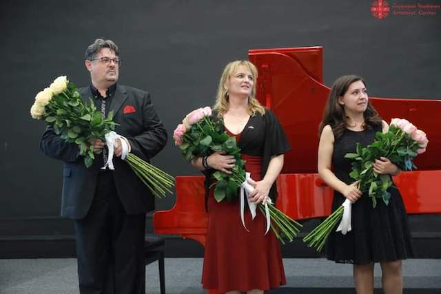 Nikolina Pinko i Eva Kirchmayer Bilić, izvele su himne Republike Hrvatske i Republike Armenije, a koncert su započele Molitvom Antuna Sorkočevića, Dubrovčanina, skladatelja i diplomata. Nizale su se skladbe Dore Pejačević (Pjesma), Ivane Lang (Murve), Slavka Modrijana (Svečica dogarja), Ivana pl. Zajca (Ljuljanka Jelene) Ive Tijardovića (Daleko m’e biser mora), Darka Domitrovića (She walks in Beauty na stihove Lorda Byrona), Nikoline Pinko (Bože, Ti znaš) i Jakova Gotovca (Oda zemlji), te armenskih Komitasa, Babajanyana (Melodija), Mirzoyana i Tigranyana (arija Anuš). Dirljivo je bilo izvoditi Komitasov ‘Chinar es‘, u zgradi koja nosi ime velikoga armenskoga glazbenika, etnomuzikologa, skladatelja, dirigenta, pjevača, u dvorani inspirativnog ugođaja i akustike, čiji stakleni zid otvara nadahnjujući prizor stabla (Chinar) uz koji stoji Komitasov kip. Odabir Mirzoyanovoga ‘Tužnog valcera‘ bio je glazbena posveta poznanstvu između značajne hrvatske pijanistica Melite Lorković (svojevremeno Evinoj profesorici), a dirljiva arija Anuš iz prve armenske istoimene opere i Nikolinina interpretacija, posebno je dirnula publiku. Zapadnoeuropsku glazbenu baštinu glazbenice su predstavile poznatim arijama G. Puccinija (Un bel di vedremo) i F. Cilee (Io son l’umile ancella). Iznenađenje publici umjetnice su priredile, kada su, u drugome dijelu svoga nastupa, odjenule armensku tradicijsku nošnju (taraz) i armenski tradicijski nakit i oglavlje. Koncert je završio stajaćim ovacijama nazočne publike uz neskriveno oduševljenje i zahvalnost za priređeni doživljaj. Druženje se nastavilo u prostorima Komitas Muzeja – Instituta, na prigodnome prijemu. Drugi koncert je održan u utorak 25. lipnja 2024., u Katedrali Svete Bogorodice od sedam žalosti u Gyumriju. Ovdje posebno treba napomenuti da u crkvama Armenske Apostolske Crkve u Armeniji ima tek nekoliko orgulja, s obzirom da se tek u novije vrijeme armenska liturgijska glazba uz pratnju elektronskih orgulja i ne postoji redovita praksa održavanja koncerata, na kakve smo u Hrvatskoj i Europi navikli. Stoga hrvatski umjetnici izriču posebnu zahvalnost nadbiskupu nadbiskupije Shirak, Mikayelu Ajapahianu, na velikodušno prihvaćenoj ponudi i više nego srdačnom gostoprimstvu, te pomoći pri neposrednoj organizaciji. Na koncert u Gyumri, pod nazivom ‘Hrvatska sakralna glazba – pjevana molitva na izvoru kršćanstva‘, došao je diplomatski savjetnik g. Goran Prokopec iz Veleposlanstva RH u Grčkoj, kojega je dočekao Honorarni konzul Republike Hrvatske za Republiku Armeniju, g. Artashes Kazakhetsyan. ![]() Nikolina Pinko i Eva Kirchmayer Bilić