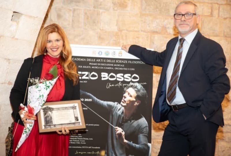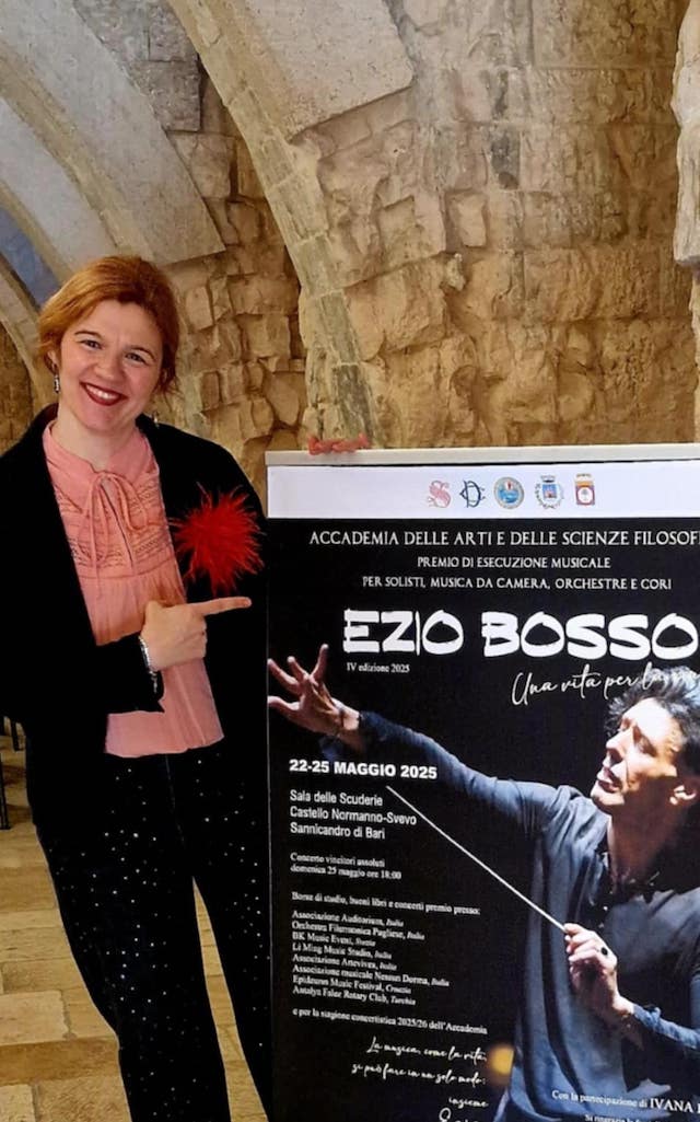 In May 2025, the renowned Croatian pianist and writer, Ivana Marija Vidović from Dubrovnik, spent her third time in Apulia in Sannicandro di Bari as part of the jury of the famous international competition, which she chaired again in the imposing Castello Normanno-Svevo fortress. The competition is named Premio Ezio Bosso after the early passing of the brilliant musician, conductor, composer, pianist and, above all, humanist from Turin, Ezio Bosso. The sister of the celebrated and brilliant musician Ivana Bosso became the honorary president of this competition as part of this year’s event, and our fellow citizen pianist Ivana Marija Vidović was awarded the title of honorary Academician “Accademico ad honorem” by the Academy Senate, which is the first such title abroad for a citizen of the city of Dubrovnik.
